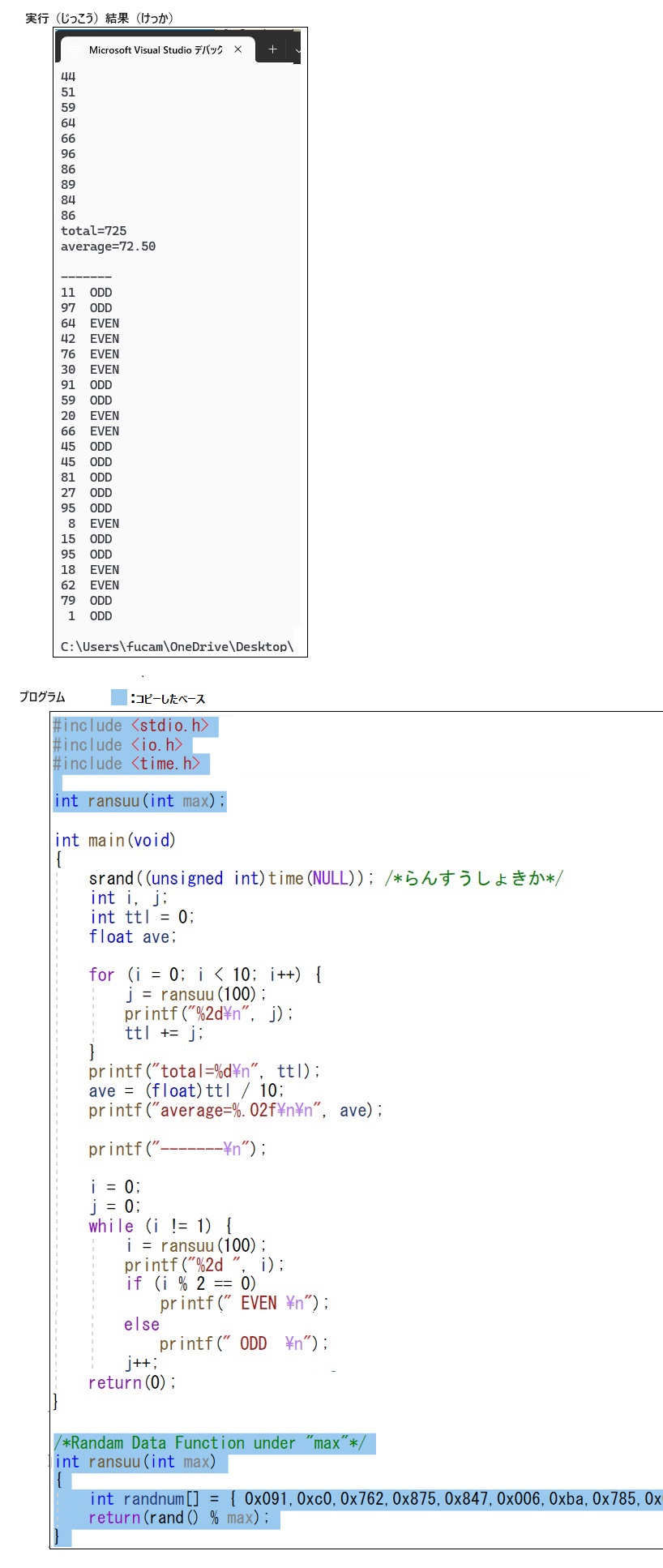 以下(いかのように100より小(ちい)さい乱数(らんすう)を10個(こ)表示(ひょうじ) その合計(ごうけい)と平均(へいきん) 乱数(らんすう)、1が出るまでのループのそのカウント